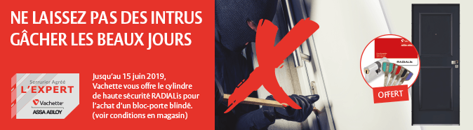 Jusqu’au 15 juin 2019, Serrurerie GT votre serrurier agréé l'Expert Vachette à Toulouse vous offre le cylindre de haute sécurité RADIALis pour l’achat d’un bloc-porte blindé Vachette.